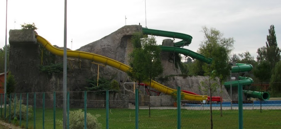 Świetne miejsce na nocleg w tym mieście - kamerki bankowe czuwają. Rano przeniosłem się pod termy, najpierw śniadanko, później pluskanie się. Termy nowe, niedawno rozbudowane ze starego kąpieliska ale zupełnie nie sa nastawieni na zagranicznych turystów. Cennik przy wejściu mocno rozbudowany - tylko po węgiersku. W środku napisy na toaletach i prysznicach tak samo (nie ma nawet ikonek) więc trzeba umieć odróżnić férfi od női :) Kupiłem bilet na termy - okazało się już w środku, że oprócz trzech basenów z ciepłą wodą (trochę podobna do tej w Csokonyavisonta, bo pachnąca ropa naftowa) nie ma nic więcej. Przejście do części z saunami wymaga innego biletu. Podobnie, widziałem z góry (bo termy są na piętrze) basen z bąbelkami i masażami (nie działały ale chyba tylko dlatego, że nikogo tam nie było), ale przejść już tam nie mogłem.